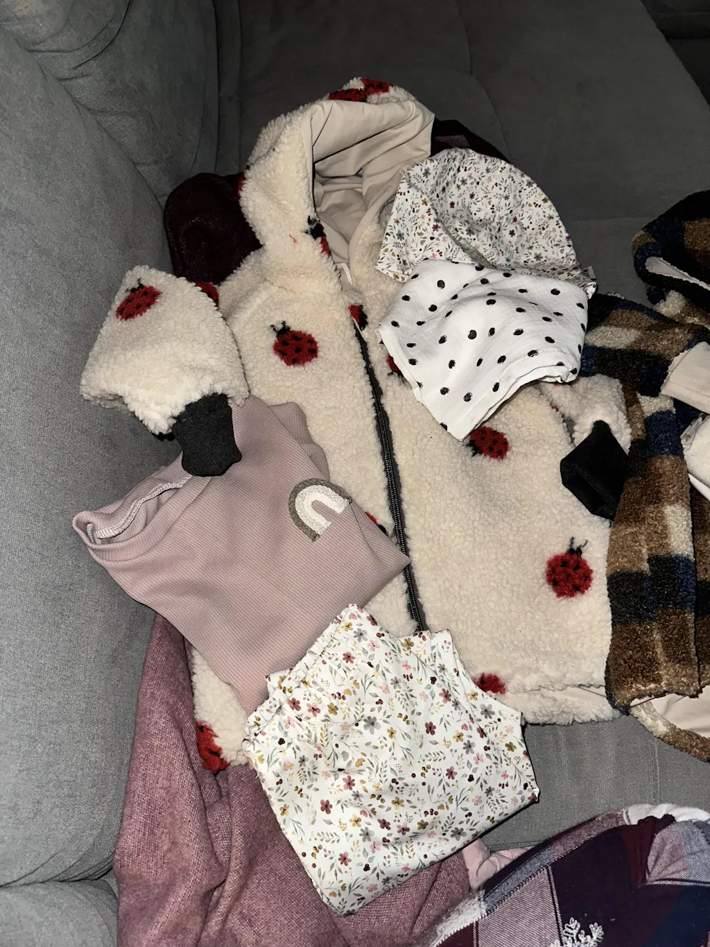 Es wird viel bunte und oder Kleidung mit Printstoffen enthalten sein bspw. eine Jacke, T-Shirt, Hose , Latzhose , Pullover usw... du wirst überrascht :)